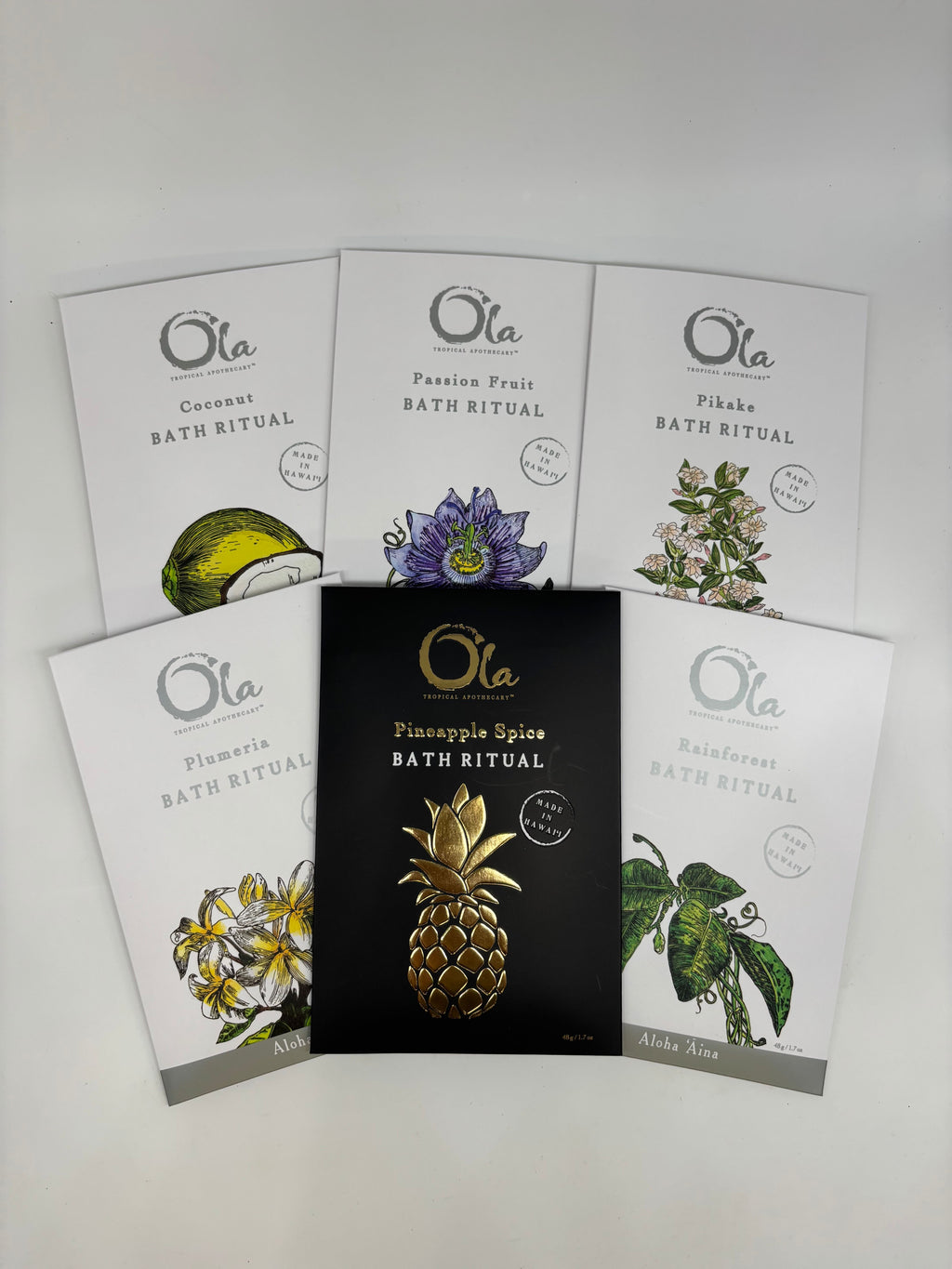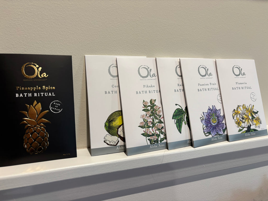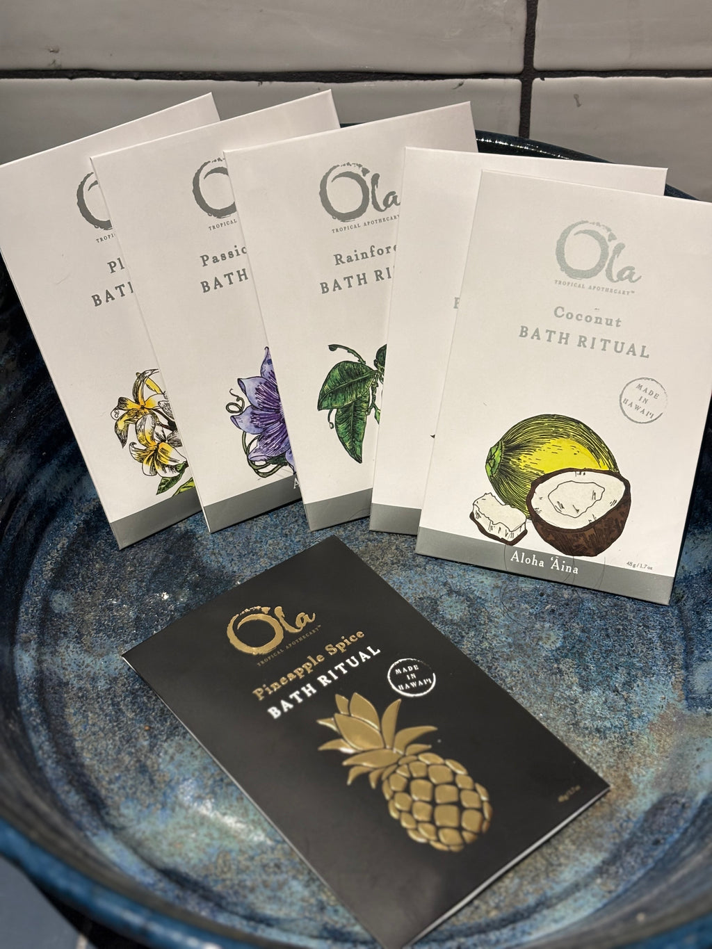 Ola Bath Rituals combine deeply moisturizing and healing ingredients like pure Hawaiian sea salt, raw sugar, coconut milk, organic coconut oil, and extracts of ginger, bamboo, and taro.